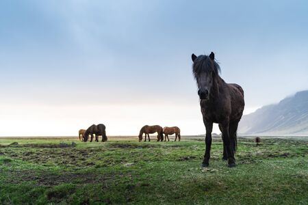 Travel to Iceland. herd of horses in a field on the mountains and dramatic sky background