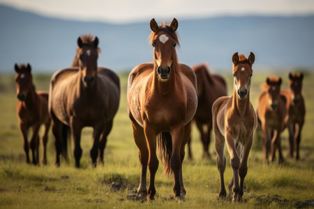 A group of wild horses standing on a beautiful meadow, their manes blowing in the wind as they bask in the sunlight