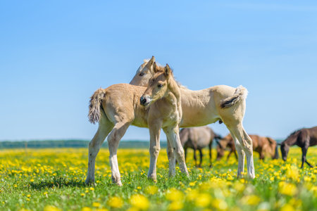 two gray, dun colored sweet foals playing and staying together in the meadow