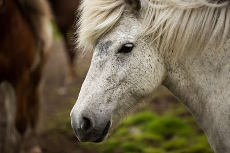 close up of iceland horse with beatiful hair watching into the camera grassland