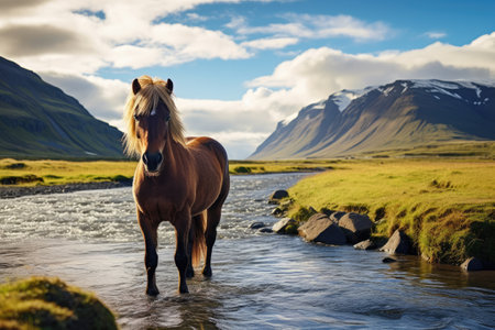 Icelandic horse in the river. Beautiful Icelandic landscape. Iceland, Icelandic horse in the field of scenic nature landscape of Iceland, AI Generated