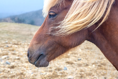 Iceland horse pony with white mane and brown fur in sunrise and wind closeup
