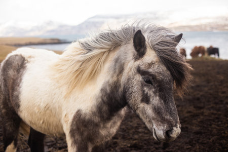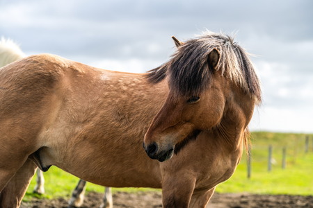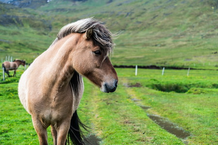 Icelandic horse in the field of scenic nature landscape of Iceland. The Icelandic horse is a breed of horse locally developed in Iceland as Icelandic law prevents horses from being imported.