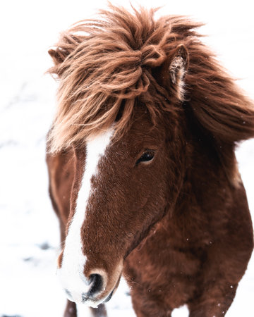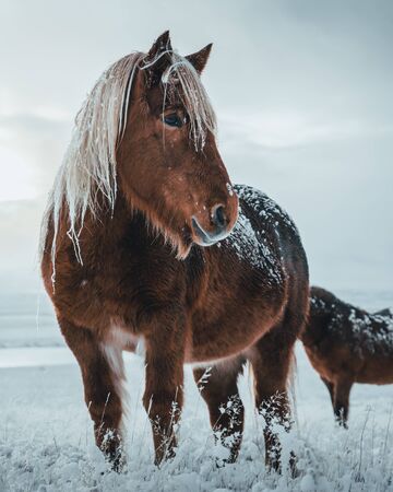 Typical Icelandic hairy horse grazing in snow blizzard. Iceland breed horse in wintertime in hard conditions snowy freezing winter at Iceland.