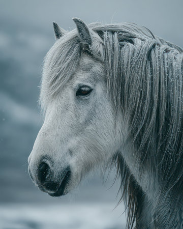 This stunning portrait captures a serene horse with a frosty mane, set against a snowy backdrop. The calm expression evokes a tranquil winter atmosphere.