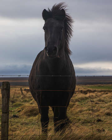 A portrait of a black horse behind wire fences in a meadow under a cloudy sky