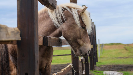 Close-up portrait of an Icelandic horse in a wooden paddock on a farm in winter.