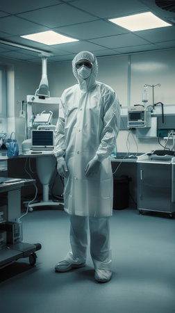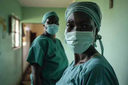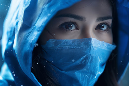 A female medical professional in a blue surgical mask standing in an operating room. Ai generated