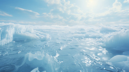 Clear ice chunks are spread out over a snowy surface, glistening under soft sunlight. The cold landscape suggests a serene winter day, with clouds in the background.
