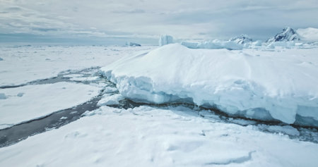 Massive snow covered ice floe drifting frozen arctic ocean. Beautiful winter landscape with icebergs and mountain range under cloudy blue sky. Wild nature Antarctica scenery. Low angle drone shot