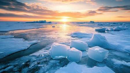 Witness the breathtaking beauty of a sunrise illuminating icebergs in a tranquil glacial landscape. This scenic view captures the essence of nature's icy wonder.