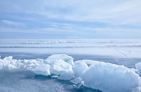 Winter landscape. Ice hummocks on the frozen lake. Blue sky with white clouds.
