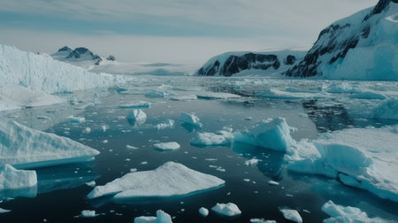 Landscapes of icebergs and rivers are cold and calm. AI Generated.
