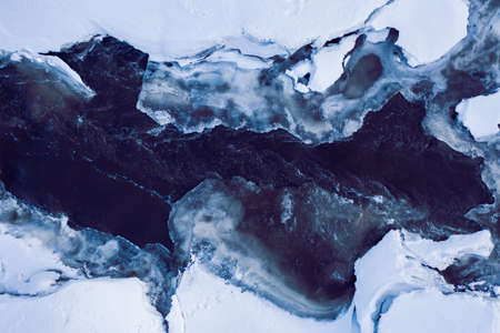 Amazing view of a frozen lake with partially thawed ice, showcasing intricate textures and captivating contrasts in shades of blue and white.