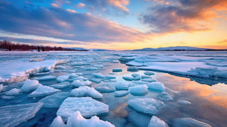 Stunning sunset reflected on a frozen river. Ice floes dot the surface.