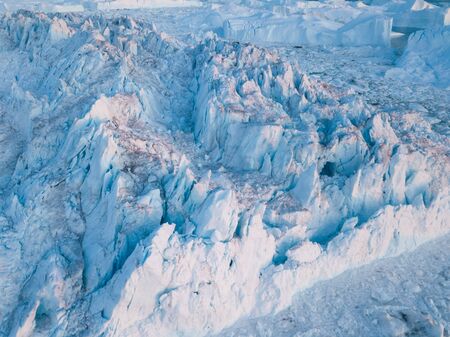 Icebergs drone aerial image - Climate Change and Global Warming. Icebergs from melting glacier in icefjord in Ilulissat, Greenland. Arctic nature ice landscape in UNESCO World Heritage Site.