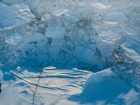Ice floes on the water surface of the lake. Aerial top down view. Baikal lake, Siberia, Russia. Abstract nature background
