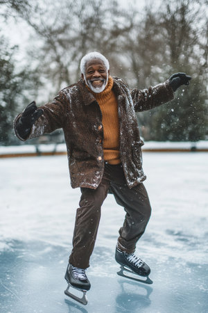 black elderly man ice skating on frozen pond in winter. senior activity, leisure, healthy lifestyle