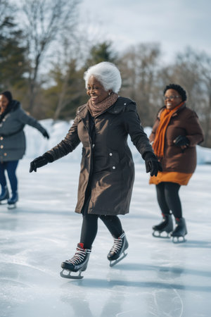 black old woman ice skating on frozen pond in winter. senior activity, leisure, healthy lifestyle
