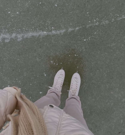 A girl skates on a frozen lake. Legs of a girl in white skates on a frozen lake, on a skating rink.