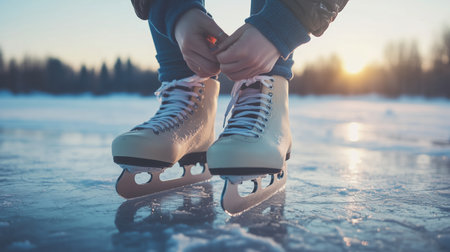 Person tying ice skates on a frozen lake during sunset, creating a serene winter atmosphere