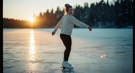 A young woman ice skating on a frozen lake during sunset, wearing a cozy sweater and skates, with trees in the background