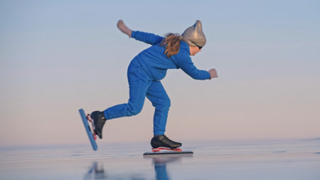 The girl train on ice speed skating. The child skates in the winter in blue sportswear suit, sport glasses. Children speed skating sport. Outdoor slow motion. Snow capped mountains, beautiful ice.