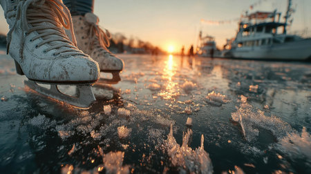 Close-up of ice skates gliding across melting ice at sunset, with bokeh lights sparkling on the wet surface.