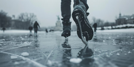 The feet of an ice skater, clad in skates, glide across the frozen surface of an ice rink, capturing the motion and chill of the sport