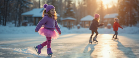 A young girl in a vibrant purple outfit glides gracefully across a shimmering ice rink, her joyful expression radiating pure delight. The warm glow of the setting sun casts a magical light over the snowy landscape, while two other skaters in the background add to the enchanting winter scene.