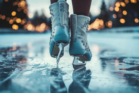 A captivating close-up view of a figure skater's white skates as they glide effortlessly over a beautifully maintained ice rink surface, showcasing the serene atmosphere of winter sports.