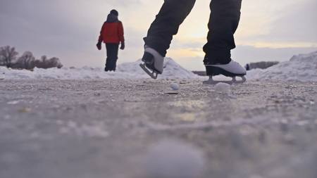 Closeup skating shoes ice skating outdoor at ice rink. Healthy lifestyle and winter sport concept at sports stadium