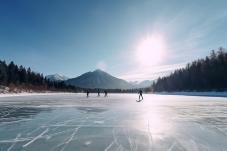 Frozen lake people skating. Snow lake active leisure season. Generate Ai
