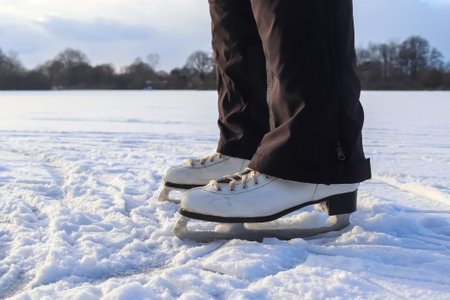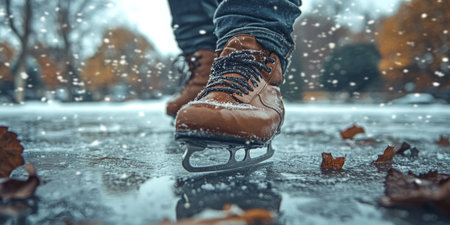 Winter Adventure on Ice Tied Boots of an Athlete Amidst Snowy Leaves in a Joyful Holiday Setting