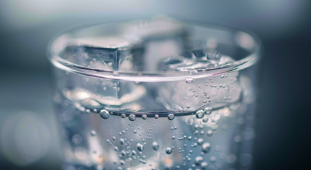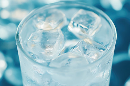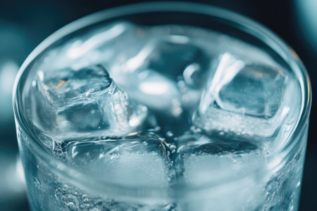 A visually captivating image of a glass filled with sparkling water and ice cubes, illuminated by soft blue light, creating a refreshing and serene ambiance.