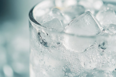 A closeup view of a glass filled with ice cubes and water, showcasing a refreshing drink ideal for warm days. Perfect capture for beverage lovers and summer themes.