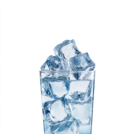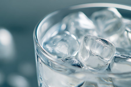 A clear glass filled with cold water and ice cubes, capturing the essence of refreshment and hydration. Ideal visual for wellness and health themes.