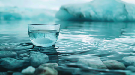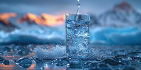 A glass of clean water on a background of icebergs and ice