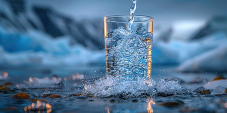 Fresh water is being poured into a transparent glass filled with ice cubes creating splashes and bubbles against a dark background emphasizing the coolness of the drink.