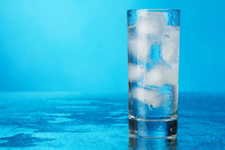 Glass of ice water on blue background, studio picture