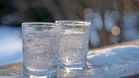 Crystal clear water in a glass against a mountain snow landscape with copyspace. High quality photo