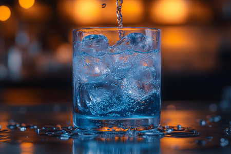 Glass filled with ice cubes on a reflective surface, with liquid pouring in, set against a warm, blurred background lighting. the contrast between cool tones of the ice and warm hues creates a relaxing, inviting atmosphere. Generative AI