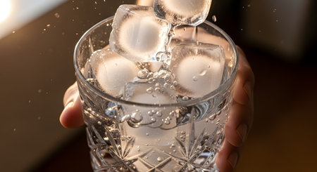 An action shot of ice cubes being dropped into an elegant crystal glass filled with water, creating a dynamic splash. A hand holds the glass against a warmly lit background, conveying a sense of refreshment and coolness.