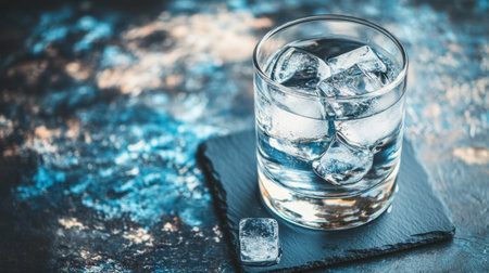 A stunning close-up of a glass filled with ice cubes, reflecting light beautifully on a rustic slate surface with a blurred blue and brown background. Perfect for beverage concepts.