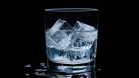 A close-up, macro still life captures a captivating image of a refreshing glass of water with glistening ice cubes. Set against a stark, dark surface, the transparent glass showcases the clear, cold drink, emphasizing its fresh and crisp qualities. Ideal for illustrating hydration and wellness, this image evokes summer and the pure purity of mineral water. Perfect for beverage marketing, promoting healthy lifestyle content, or showcasing refreshment and thirst quenching drinks.