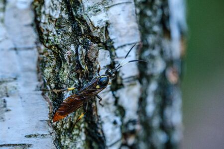 Great wasp wasp of black-orange color standing on the bark of a tree.