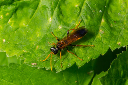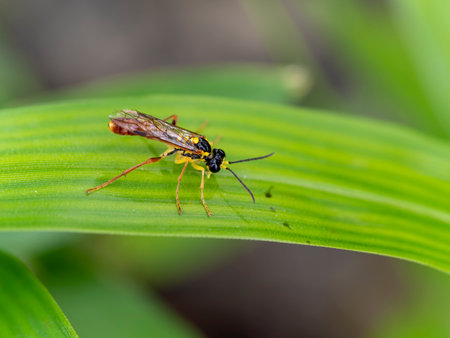 ichneumon wasp on green leaf in the wild, closeup of pictures