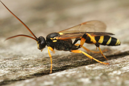 Natural closeup on a colorful yellow and black Ichneumonid wasp sitting on wood