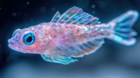 A single translucent fish glows with ethereal blue light while swimming through dark water displaying its visible internal skeleton and large reflective eye.
