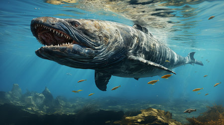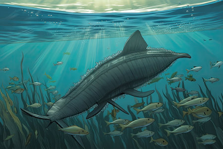 sea monster swimming past school of fish, with majestic fins through water, created with generative ai
